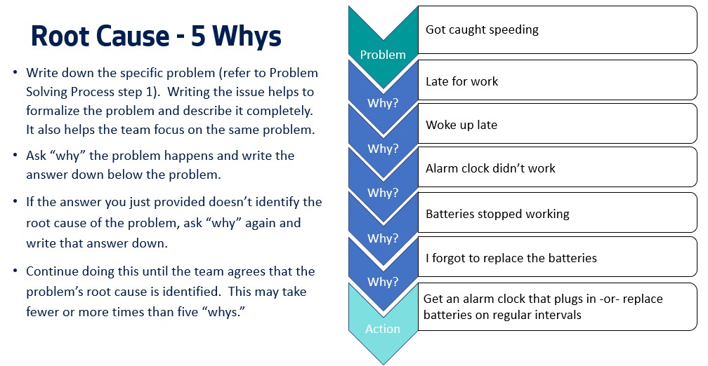 There’s a technique for root cause problem solving called “The 5 Whys”. It, like many Lean tools, is both simple and powerful. Going through the exercise of asking “why?” multiple times about the cause of a problem lets you dive down through its layers to find the true root cause that, when addressed, can solve the problem conclusively the first time.